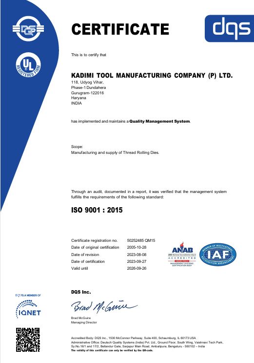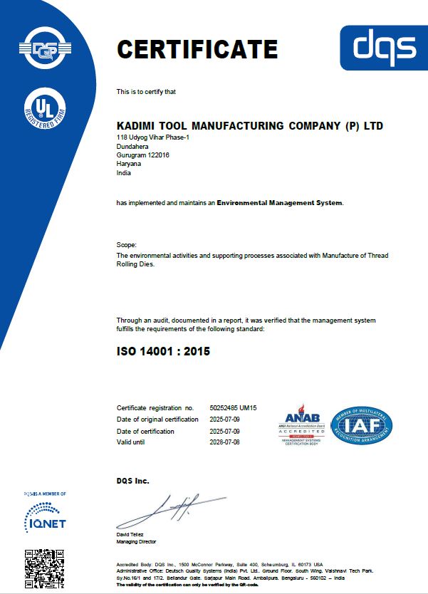 Kadimi Tool Manufacturing Company (P) Ltd. Proudly Announces Achievement of ISO 14001:2015 & ISO 45001:2018 Certifications.
